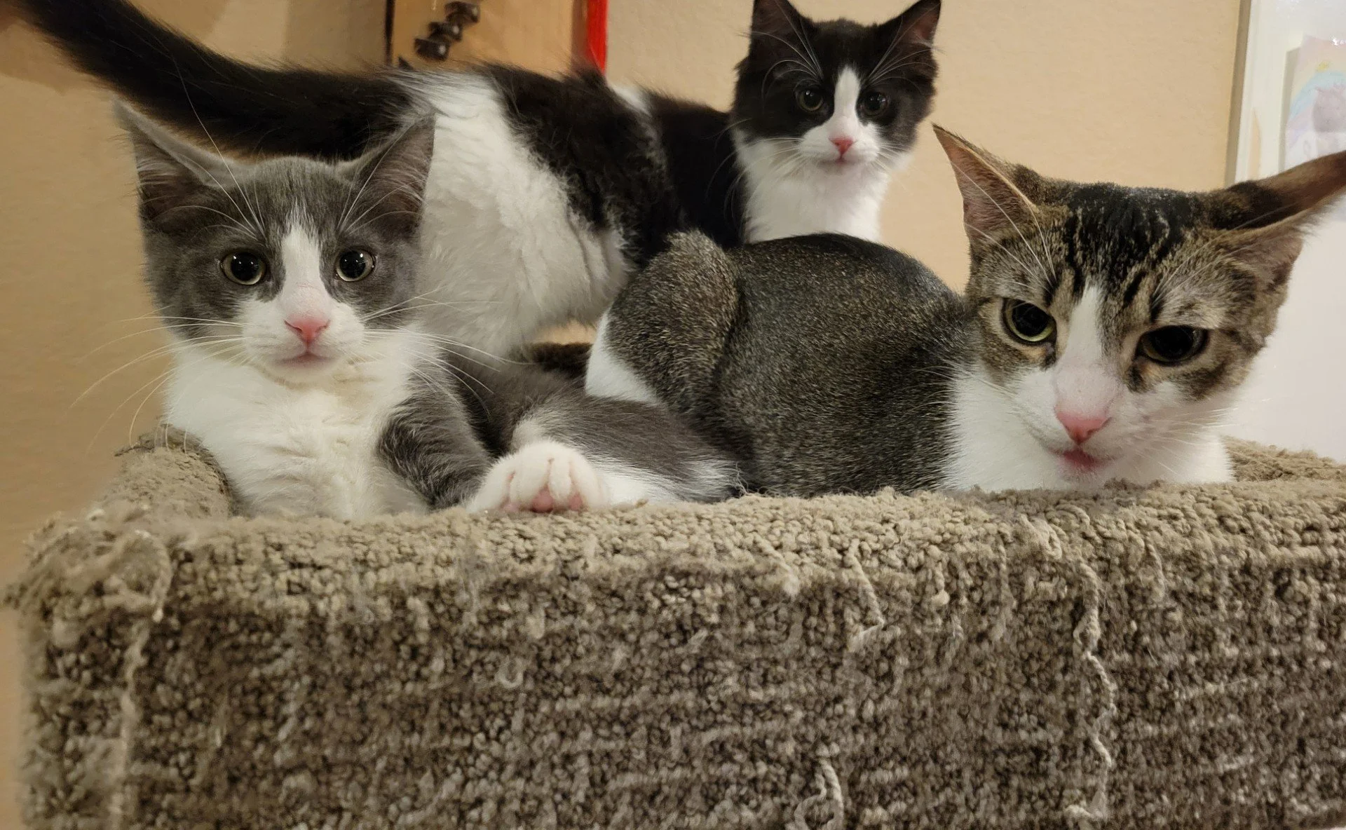 Meet Mercie (right, 1.5-2 years old?) and her 2 kitties, Maxie and Trixie